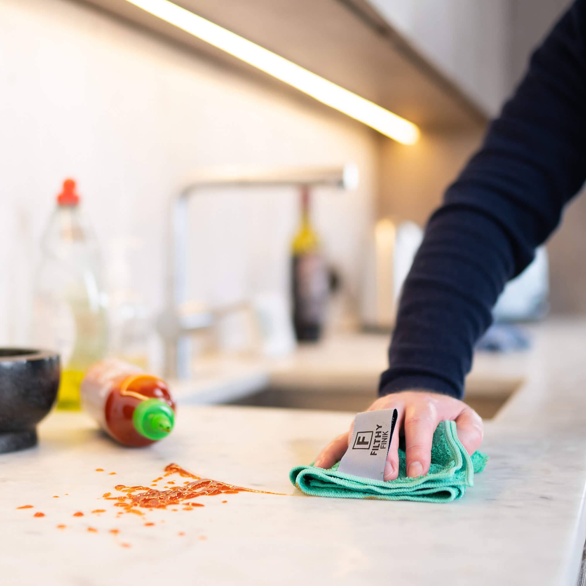 We're all about keeping it clean and green! That's why we use over 80% recycled material in all of our microfibre cleaning cloths. And if you're ready to say goodbye to your trusty Filthy Finik cloths, don't toss 'em! Send them back to us and we'll give them a second life through our recycling programme.